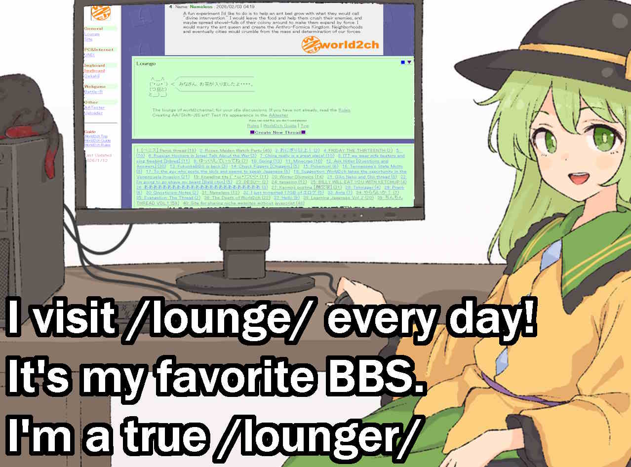 I visit /lounge/ every day! It's my favorite BBS. I'm a true /lounger/